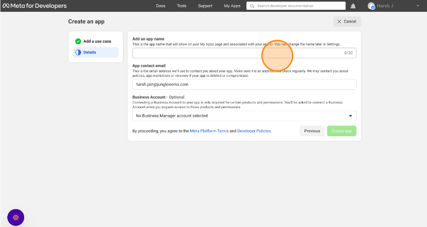 - On the next page enter the application name as “Yelo Website” in the “Add an app name” field.