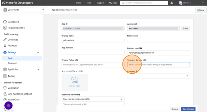 - Enter your privacy policy URL, and terms of service URL and select the application category from the listed options.
