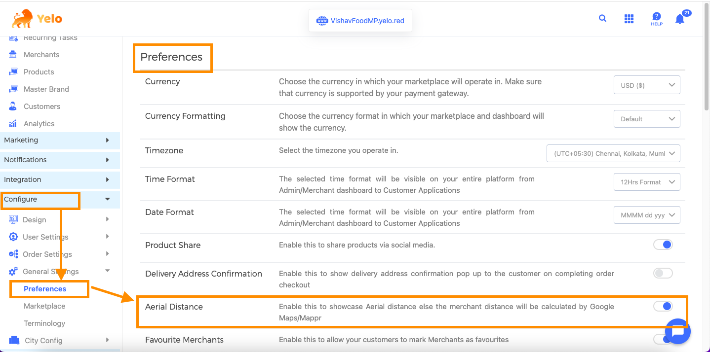 To enable “Aerial Distance” go to Yelo admin dashboard>Configre Section>General Settings>Preferences> Enable Aerial Distance Toggle